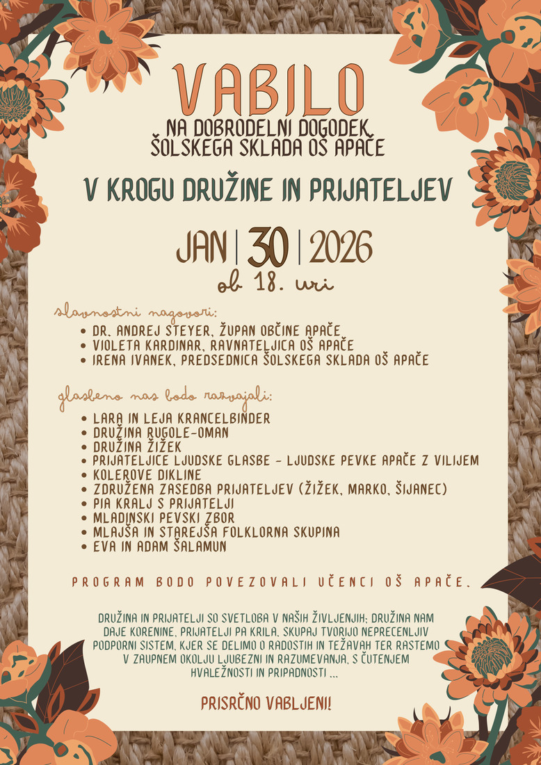Dogodek bo v petek, 30. januarja 2026, ob 18. uri, v Športni dvorani OŠ Apače.