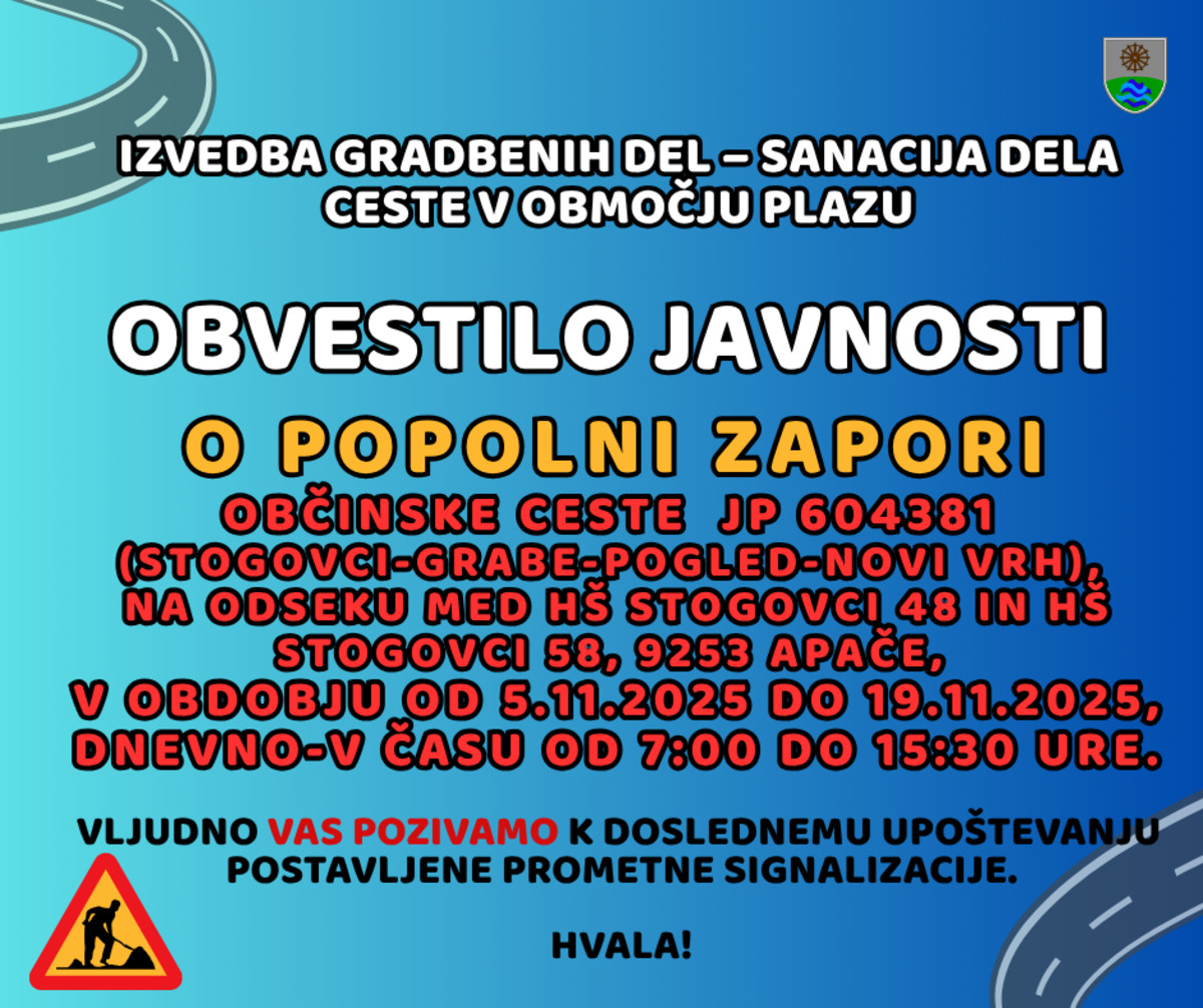 Obveščamo vas, da bo v času do vključno 19.11.2025 popolna zapora občinske ceste JP 604381 (Stogovci-Grabe-Pogled-Novi Vrh), na odseku med hš Stogovci 48 in hš Stogovci 58, 9253 Apače, v obdobju od 5.11.2025 do 19.11.2025, dnevno v času od 7:00 do 15:30 ure.
