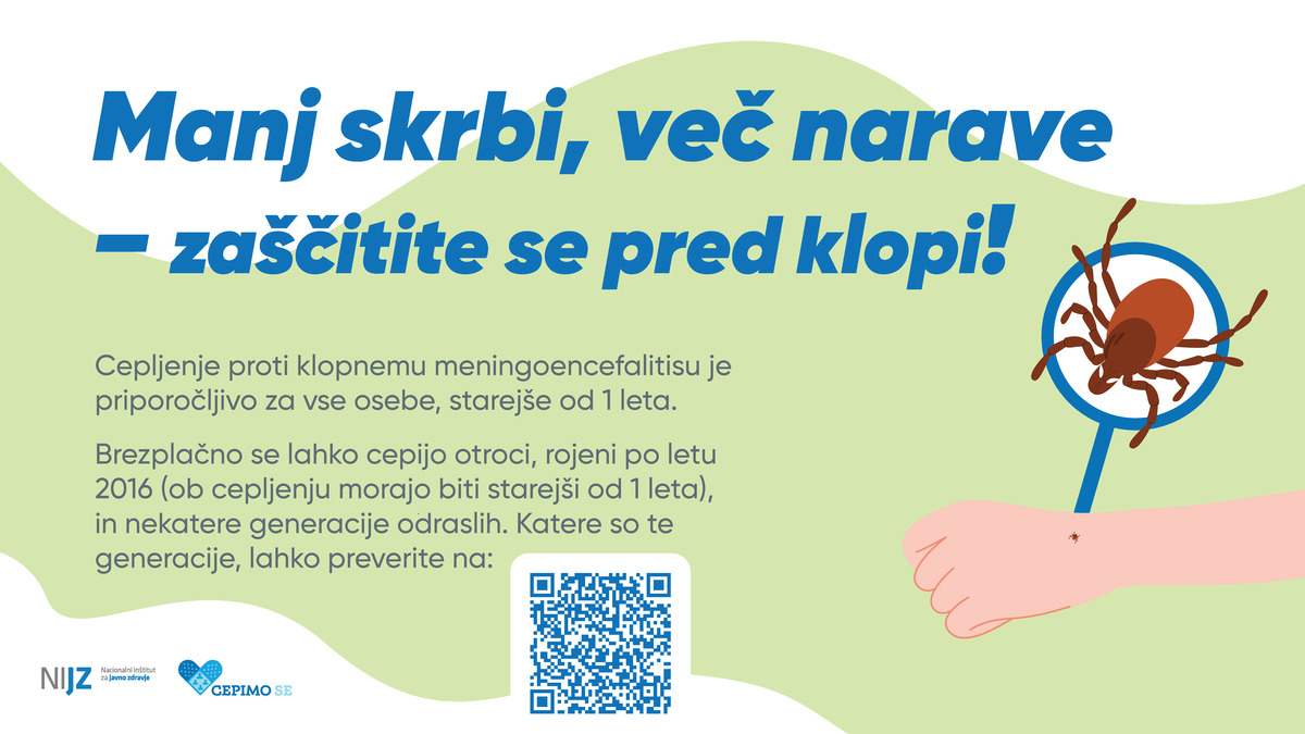 Narava se prebuja, z njo pa tudi klopi - majhne živalice, ki lahko prenašajo povzročitelje človeku nevarnih bolezni, kot sta klopni meningoencefalitis (KME) in lymska borelioza. Za KME v zadnjih letih v Sloveniji povprečno zboli okoli 100 ljudi. Nekaterim bolezen pušča trajno invalidnost, lahko vodi celo v smrt. Cepljenje učinkovito in varno ščiti pred KME.
