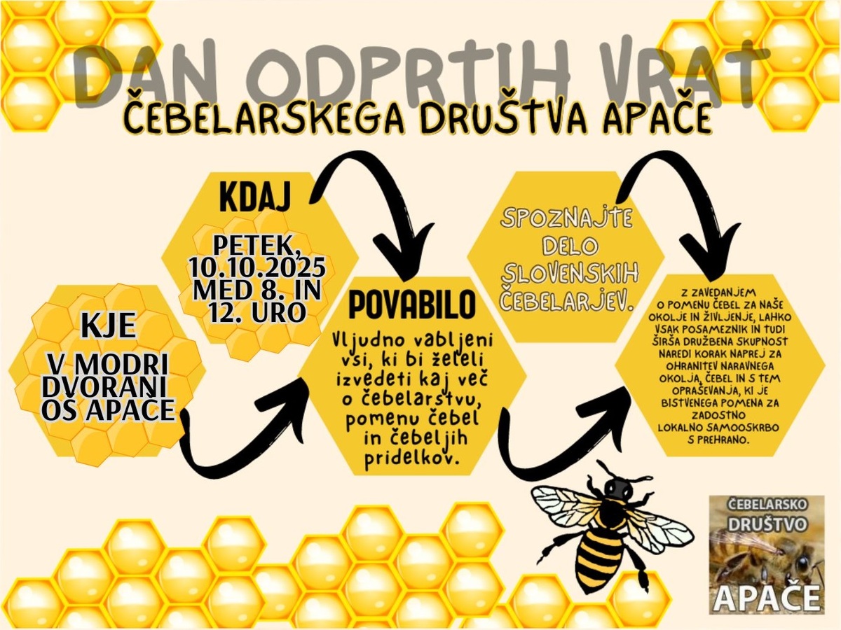 Lepo vabljeni na DAN ODPRTIH VRAT ČEBELARSKEGA DRUŠTVA APAČE, ki bo v petek, 10.10.2025, med 8. in 12. uro, v Modri dvorani OŠ Apače.