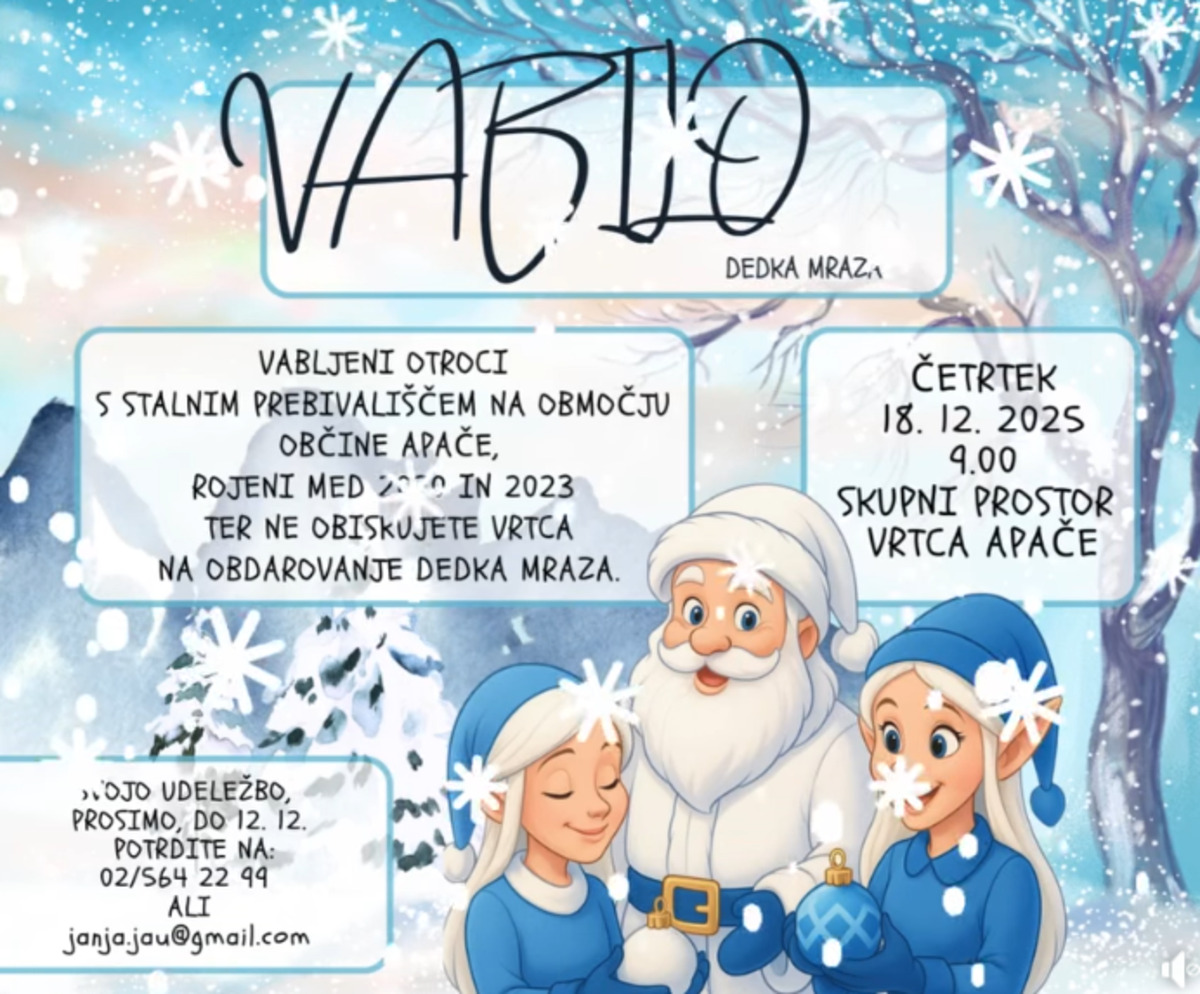 Otroci s stalnim bivališčem na območju občine Apače, rojeni med 2020 in 2023, ki ne obiskujejo vrtca, vabljeni na obdarovanje dedka Mraza.