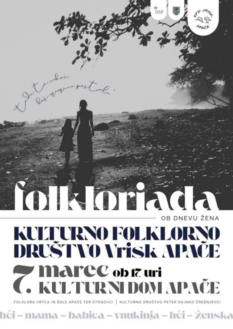 Kulturno folklorno društvo "Vrisk" Apače vljudno vabi na že tradicionalno Folkloriado ob dnevu žena, ki bo v soboto, 7. marca 2026, ob 17.uri, v Kulturnem domu Apače.